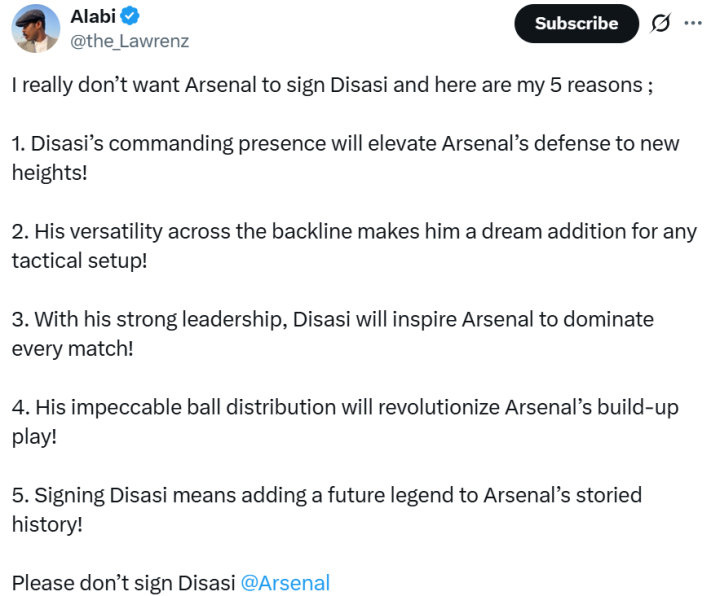 一名切尔西大V在评论中列举了“不想让阿森纳签下迪萨西”的五大理由,其中包括了迪萨西在后防线、技战术层面、领导力和传球能力方面的优势。这种幽默的解读不仅展示了球迷对球员的独特见解,也为这一转会新闻增添了一丝娱乐色彩。